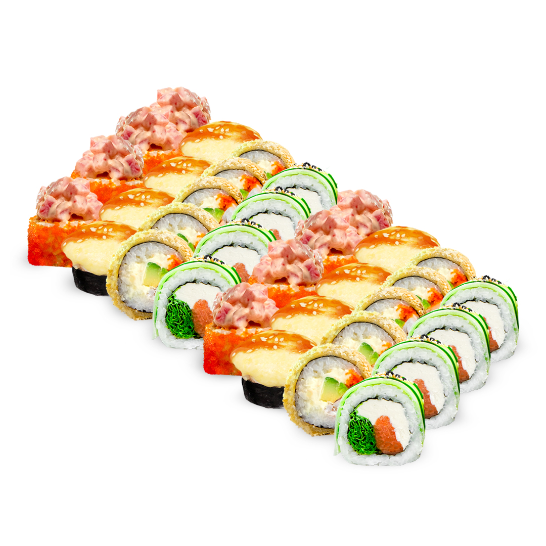 Феликс ролл с тунцом, Запечённый ролл с сурими, Горячий ролл с креветкой, Филадельфия Грин